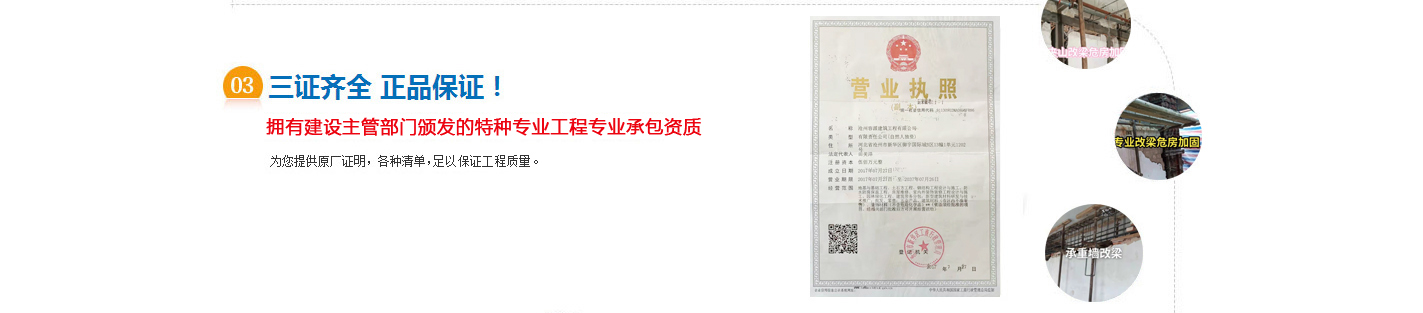 是滄州加固施工公司的企業(yè),具備結(jié)構(gòu)補(bǔ)強(qiáng)資質(zhì),并通過(guò)ISO9001:2000國(guó)際質(zhì)量管理體系認(rèn)證、環(huán)境管理體系認(rèn)證、安全管理體系認(rèn)證!" />
